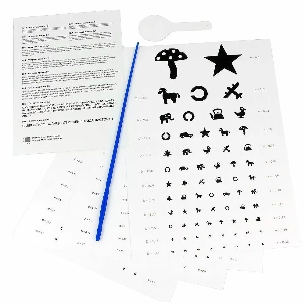 В комплект входят пять различных таблиц для проверки зрения:
