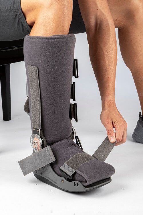 • В комплект входят две пластины для иммобилизации большеберцовой кости и икроножной мышцы, а также предусмотрены дополнительные уплотняющие пелоты для регулировки внутреннего объема и лучшей стабилизации ноги в ортезе и защитный чехол для пальцев стопы, который можно снять для дополнительной вентиляции.