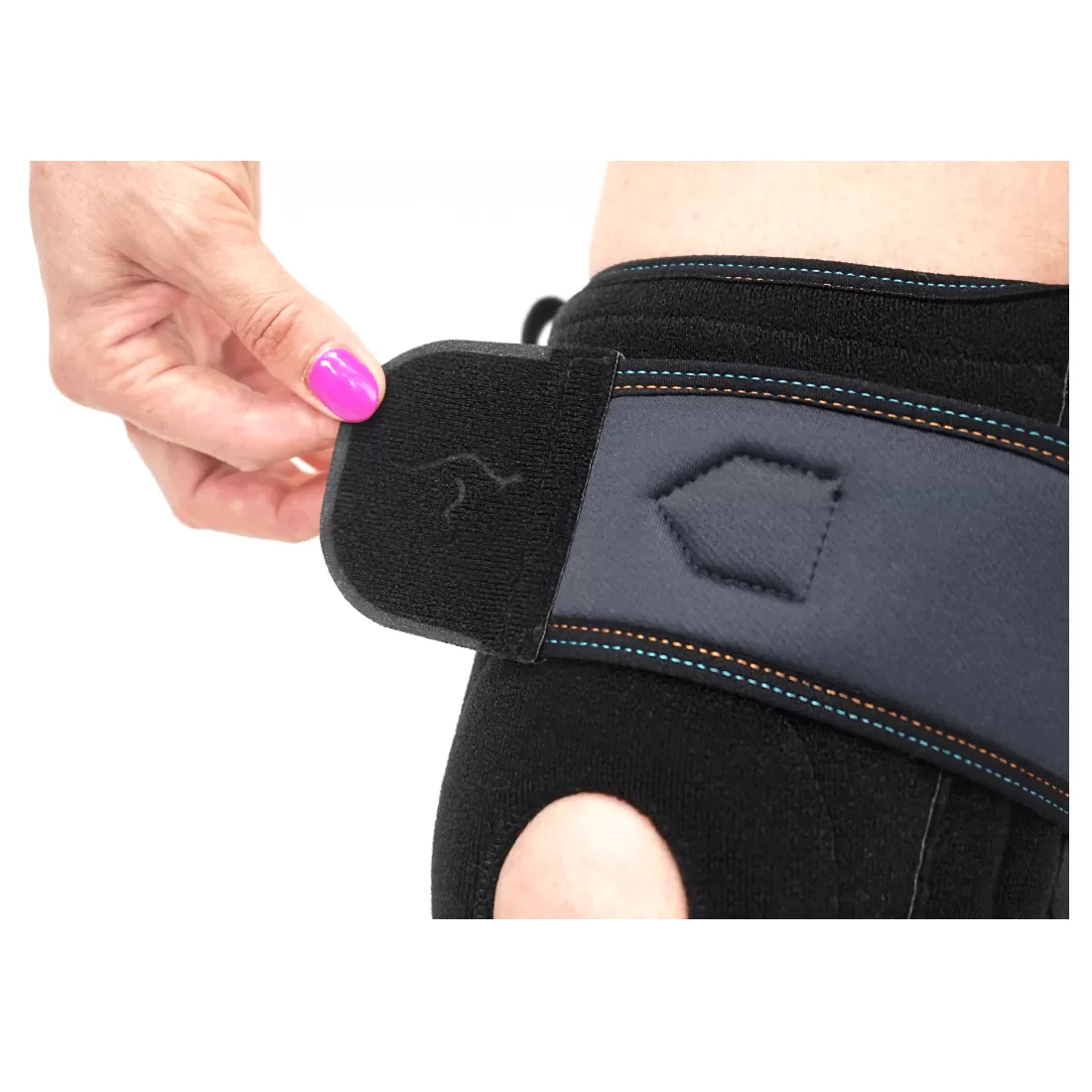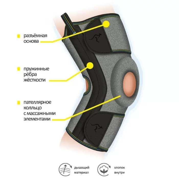 - надежно поддерживает коленную чашечку при помощи пателлярного кольца, а массажные ребра на нем улучшают местное кровообращение, что ускоряет процесс восстановления.
