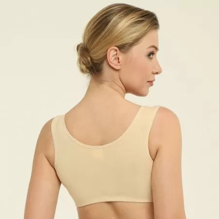 - Двухрядная застежка на крючки спереди позволяет надеть бюстгальтер без посторонней помощи и болезненных ощущений (в отличие от застежки сзади, при застегивании которой может возникать боль в руках и растяжение послеоперационных швов)