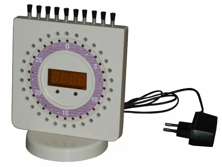 - Представляют собой электронные часы со звуковым сигналом окончания процедур, для подачи которого в корпусе часов вмонтирован зуммер. Часы обеспечивают подачу звукового сигнала после отработки любого интервала времени кратного 1 мин в диапазоне от 1 до 30 мин. Для обеспечения отсчета времени при проведении нескольких процедур одновременно магнитные штырьки имеют цифровые обозначения. Одновременно может производиться отсчет времени для десяти процедур. На циферблате расположены 30 отверстий и 30 светодиодов напротив каждого отверстия. Каждое отверстие кратное 1 минуте. Текущее время процедуры устанавливается на таймере кнопками «часы», «минуты».