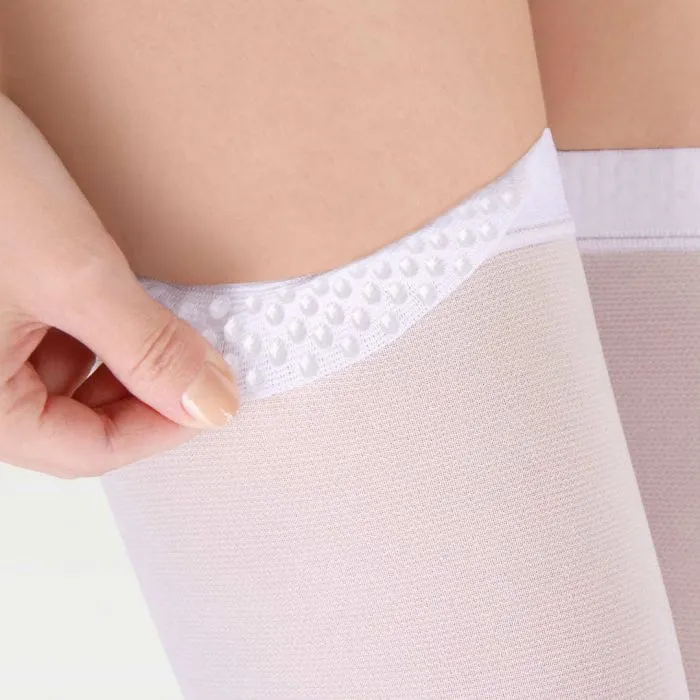 - для чулок с силиконовой лентой – не смазывать кремом или мазью ту часть ноги, куда приклеивается силиконовая лента;