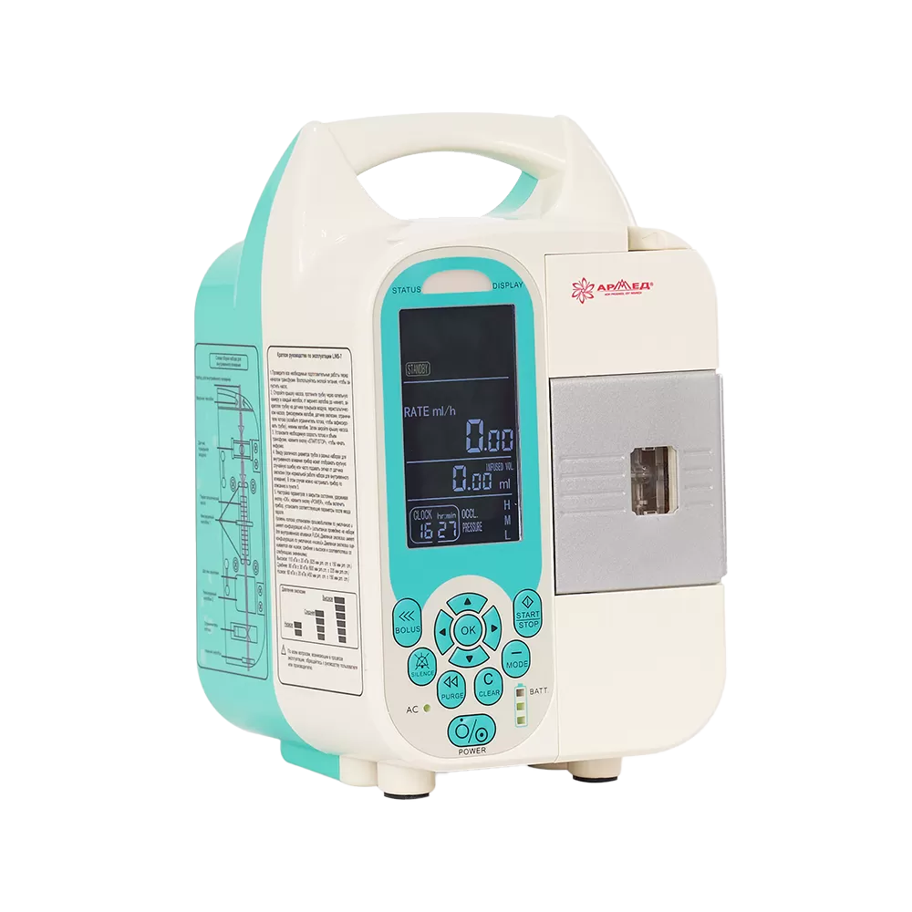 - На экране отображаются основные параметры настройки: скорость и объем вливания, время процедуры, заряд аккумулятора, подключение к электросети, системные ошибки и прочее. Показатели облегчают контроль за оборудованием.