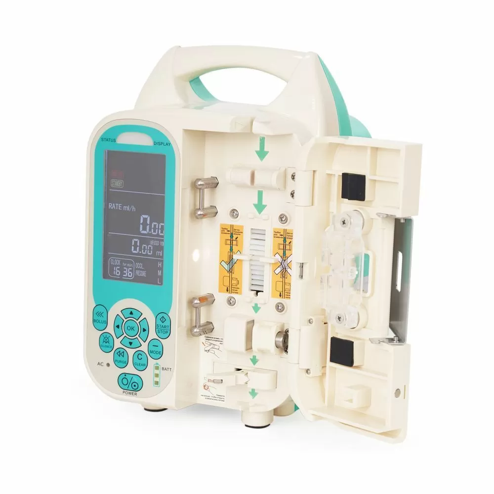 - Проводить инфузии возможно из бутылки, которая устанавливается в специальный отсек с закрывающейся дверцей. Таким образом, дозатор выполняет роль капельницы. Небольшая форма дозатора очень удобна для установки на инфузионной стойке. На верхней части дозатора расположена ручка, за которую довольно удобно переносить прибор.