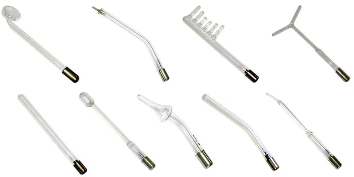 Различные насадки к прибору «дарсонваль» – это газонаполненные электроды, созданные чтобы обеспечить наиболее эффективное воздействие на определенные области тела (лицо, шея, волосистая часть головы, голени и т.д.), и многие из них взаимозаменяемы. Электроды – вещь относительно недолговечная, и время их жизни зависит от интенсивности эксплуатации. По истечении 250 рабочих часов они подлежат замене на новые. Вместе с дарсонвалем обычно поставляется набор из 3-5 стандартных насадок. Остальные «специфические» электроды в случае необходимости можно приобрести отдельно.