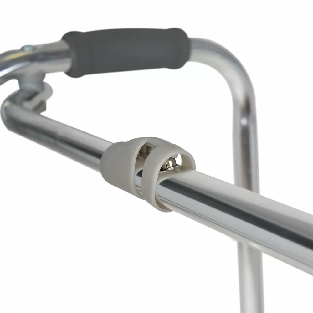 - Для регулировки высоты ходунков предназначен удобный кнопочный фиксатор, поэтому модель подходит для использования пользователями различного роста.