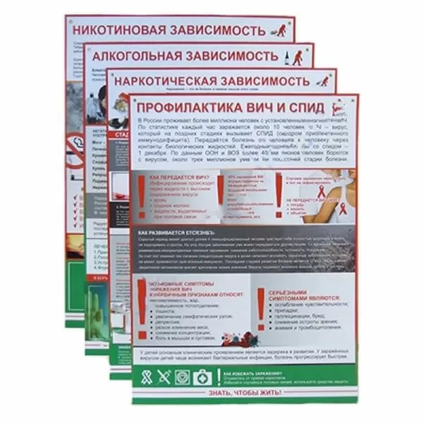 Плакаты для пропаганды здорового образа жизни. Могут размещаться в медицинских и образовательных учреждениях. Плакаты содержат картинки, схемы и текст.