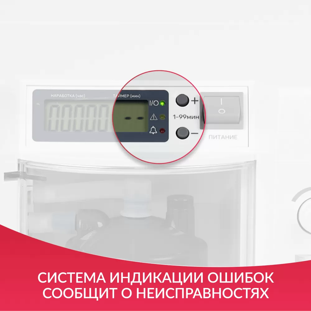 Индикаторы тревоги, встроенный таймер работы, плавная регулировка скорости потока; выход для ингаляций |