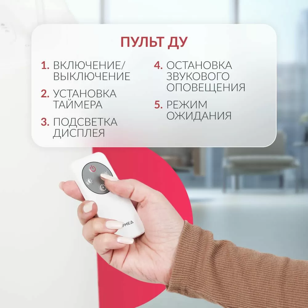 - Функция таймера. Концентратор кислорода оснащён таймером работы, позволяющим задать длительность процедуры, — во время кислородотерапии можно заниматься своими делами, не следя за часами: по истечении заданного времени прибор отключится автоматически. Диапазон установки времени составляет от 30 до 360 минут с шагом в полчаса. Таймер управляется кнопкой на лицевой панели прибора и пультом дистанционного управления.