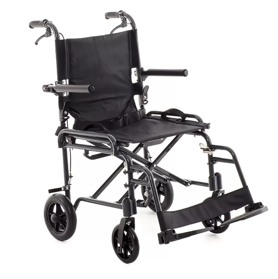 Рама каталки складывается "сторона к cтороне" и оборудована складной спинкой для максимально компактного сложения при транспортировке. Поднимающиеся подлокотники из алюминиевой трубы, покрытой мягким пористым пенополиуретаном.
