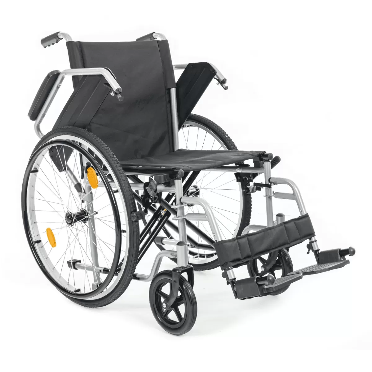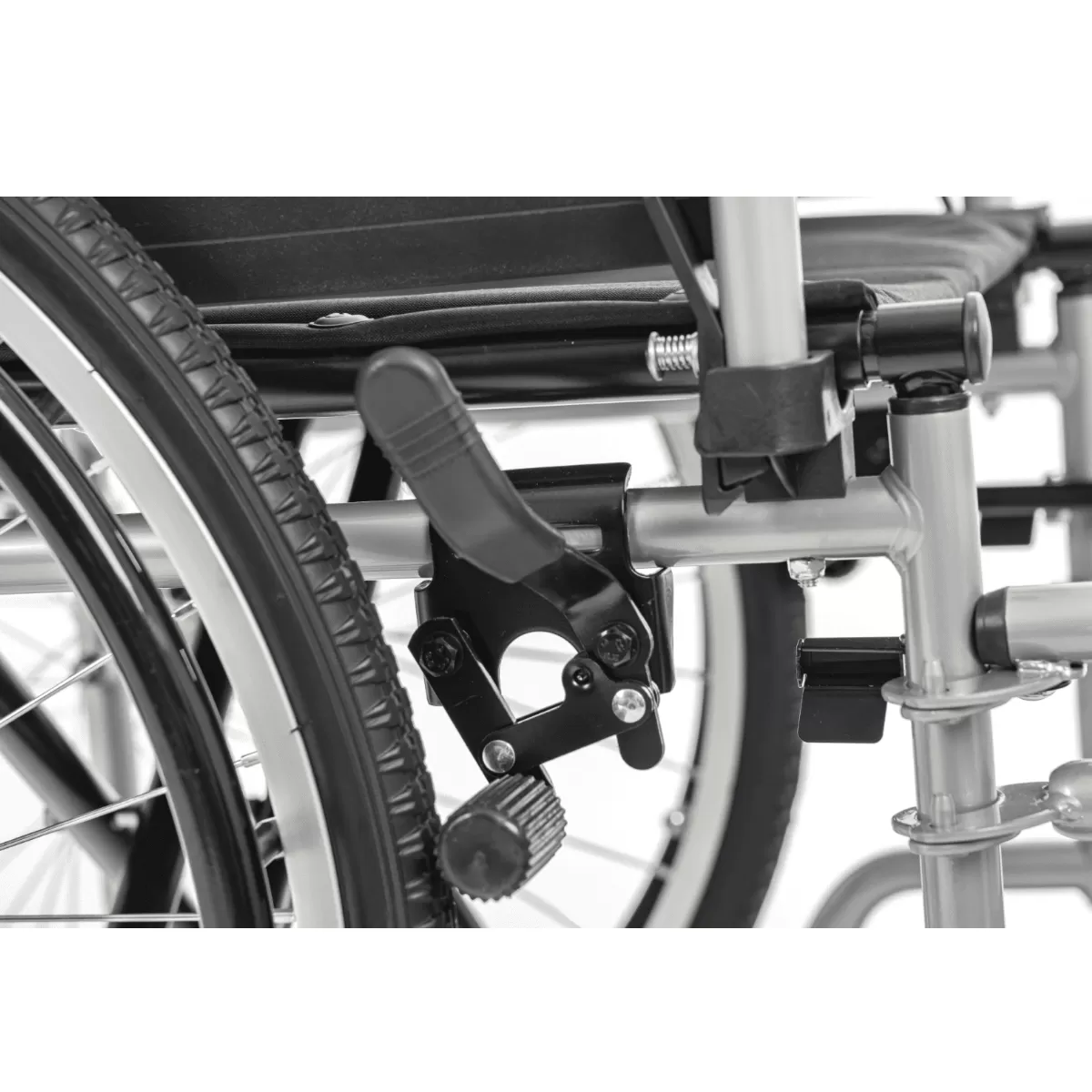 Съемные антиопрокидыватели делают езду в гору безопасной. Коляска снабжена откидными подножками и стояночным тормозом, что делает пересаживание человека из коляски и в неё более безопасным и удобным.