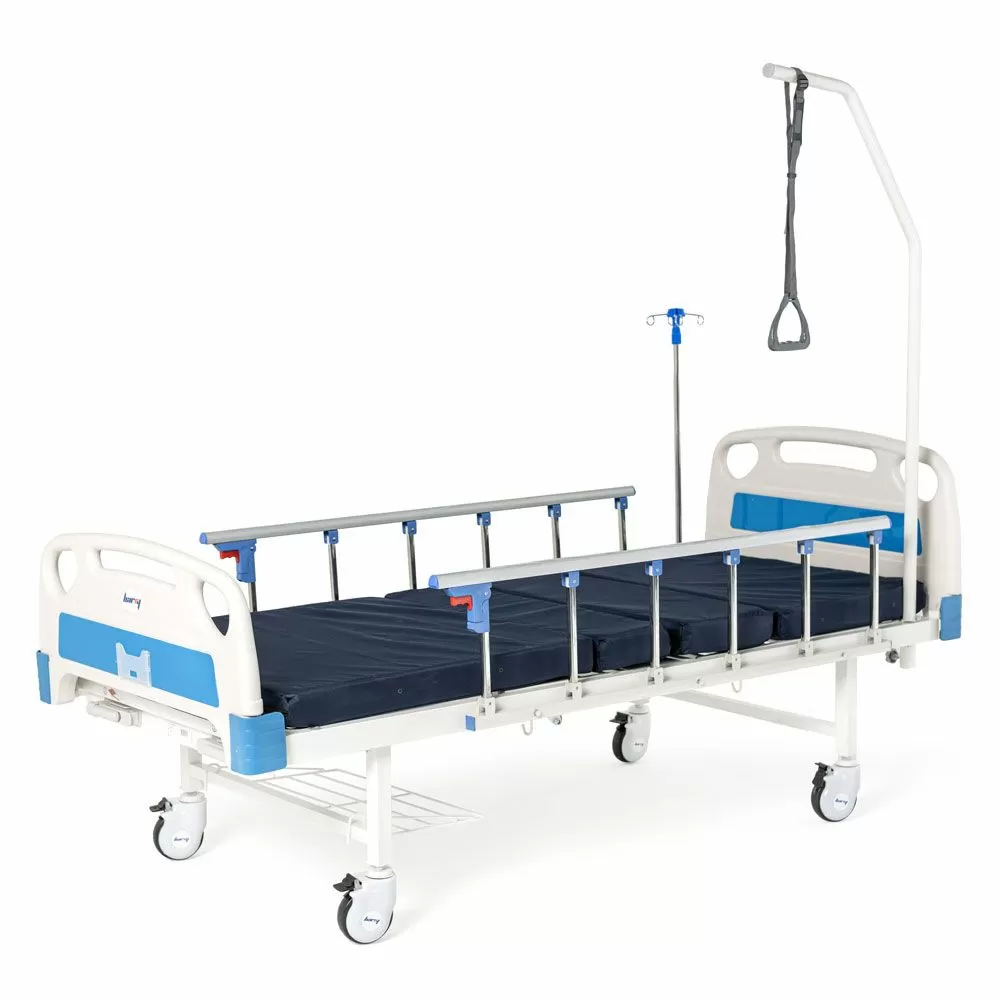 Основа рама кровати изготовлена из стали и покрыта высококачественным порошковым покрытием, что обеспечивает качественную и долгосрочную защиту от внешних воздействий, а также устойчивость к дезинфицирующим средствам.