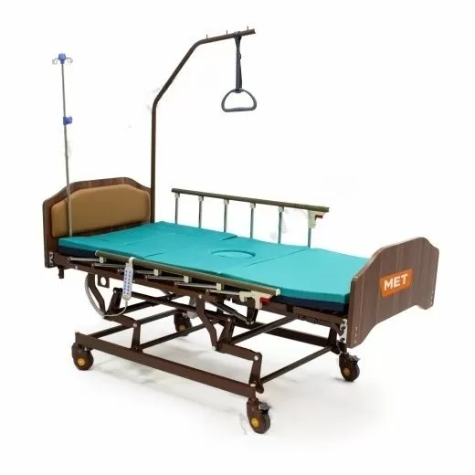 Функциональная кровать с электроприводом, электрифицированной функцией переворачивания и туалетным устройством. Головная секция имеет "ушки", что позволяет больному отдыхать и спать в сидячем положении.Кровать оснащена быстросъёмными спинками. Сняв ножную спинку можно осуществить полноценный выход из кресла.
