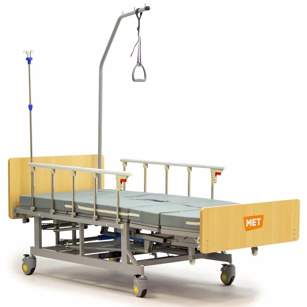 По краям кровати расположены специальные отверстия (4 штуки) для установки инфузионной стойки и других принадлежностей. В комплект входит инфузионная стойка, а также штанга для подтягивания больного с регулируемой по высоте рукояткой.