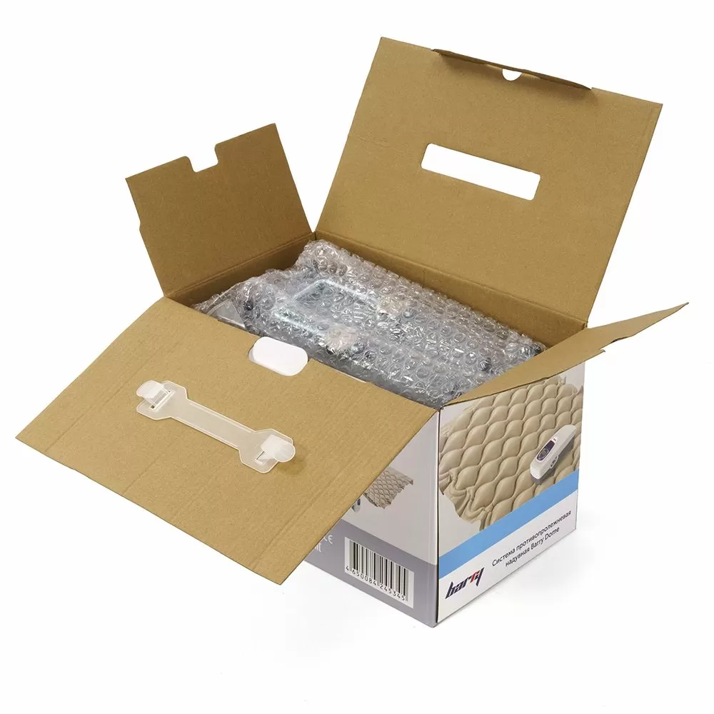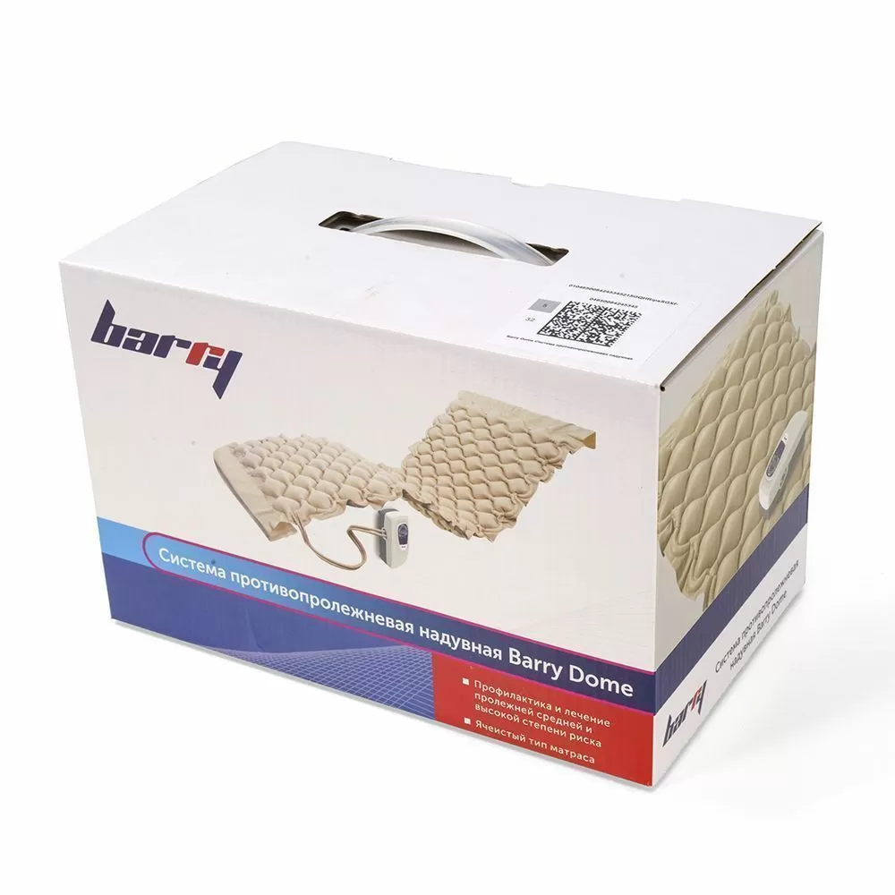 Barry Dome представляет собой ячеистый противопролежневый матрас, рекомендованный для профилактики и терапии пролежней начальной и средней степени тяжести. Благодаря своей простоте в использовании, система подходит как для домашнего ухода, так и для применения в медицинских учреждениях. В комплект входит матрас и компрессор. Продолжительность одного рабочего цикла составляет 12 минут (6 минут - первый контур, 6 - минут второй контур).