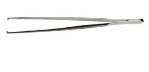 Медицинский пинцет для прочного удержания захваченной ткани и органов человека, допускающих их частичное травмирование, применяемый при хирургических операциях и анатомических исследованиях. Одна бранша которого имеет на конце два зубца, а вторая - один зубец, совмещающийся при смыкании пинцета. с впадиной между зубцами первой бранши. Пинцет изготавливается из прочной и качественной медицинской стали, которая выдерживает многократные стерилизации.