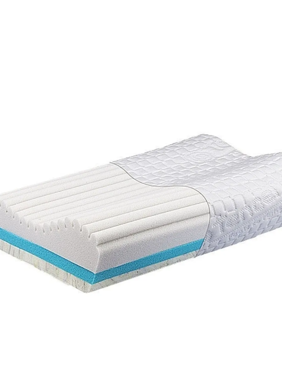 - верхний слой с «эффектом памяти» и валиками различной высоты обеспечивает правильное положение головы и шеи, дарит ощущение невесомости, не препятствует воздухообмену