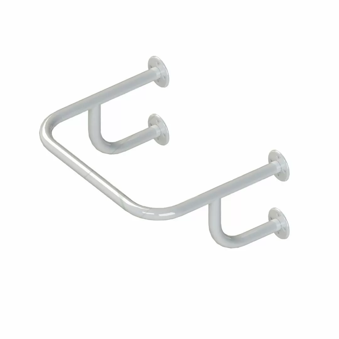 Поручень четырёх опорный настенного крепления. Диаметр фланцев 85 мм, с тремя крепежными отверстиями под шурупы диаметром 4 мм в каждом из них.