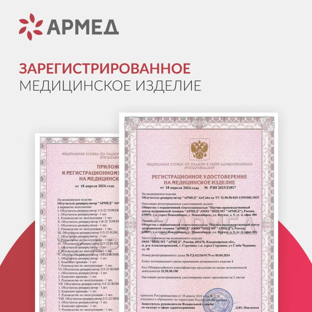 - Гарантия качества. Рециркулятор Армед 115-22 TOWER является зарегистрированным медицинским изделием. Его безопасность и эффективность подтверждены официальным сертификатом соответствия. На прибор действует гарантия 1 год.