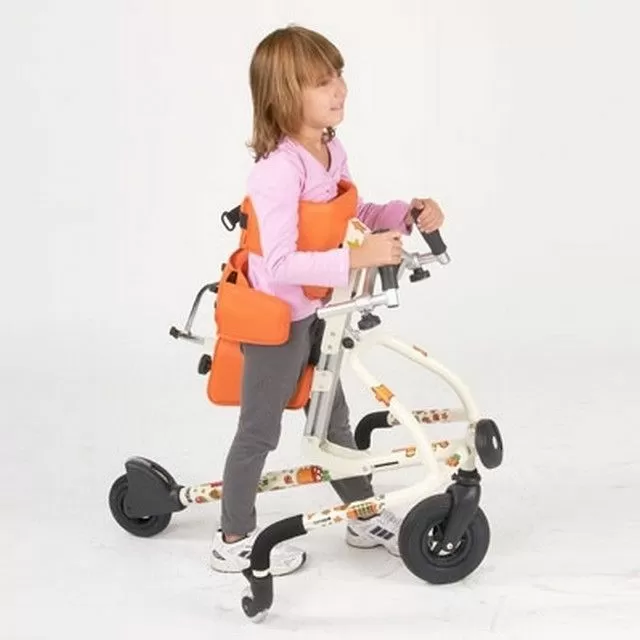 Роллаторы оснащены регулируемыми опорами, которые обеспечивают ребенку полную безопасность во время ходьбы и побуждают его делать первые шаги. Поскольку основная грудная опора наклонена вперед, центр тяжести ребенка смещается в нужном направлении. В таком положении даже ребенок с патологией разгибательной группы мышц, может (хотя бы минимально) задействовать нижние конечности и пользоваться важнейшим функциональным преимуществом ходьбы: исследовать окружающее пространство.
