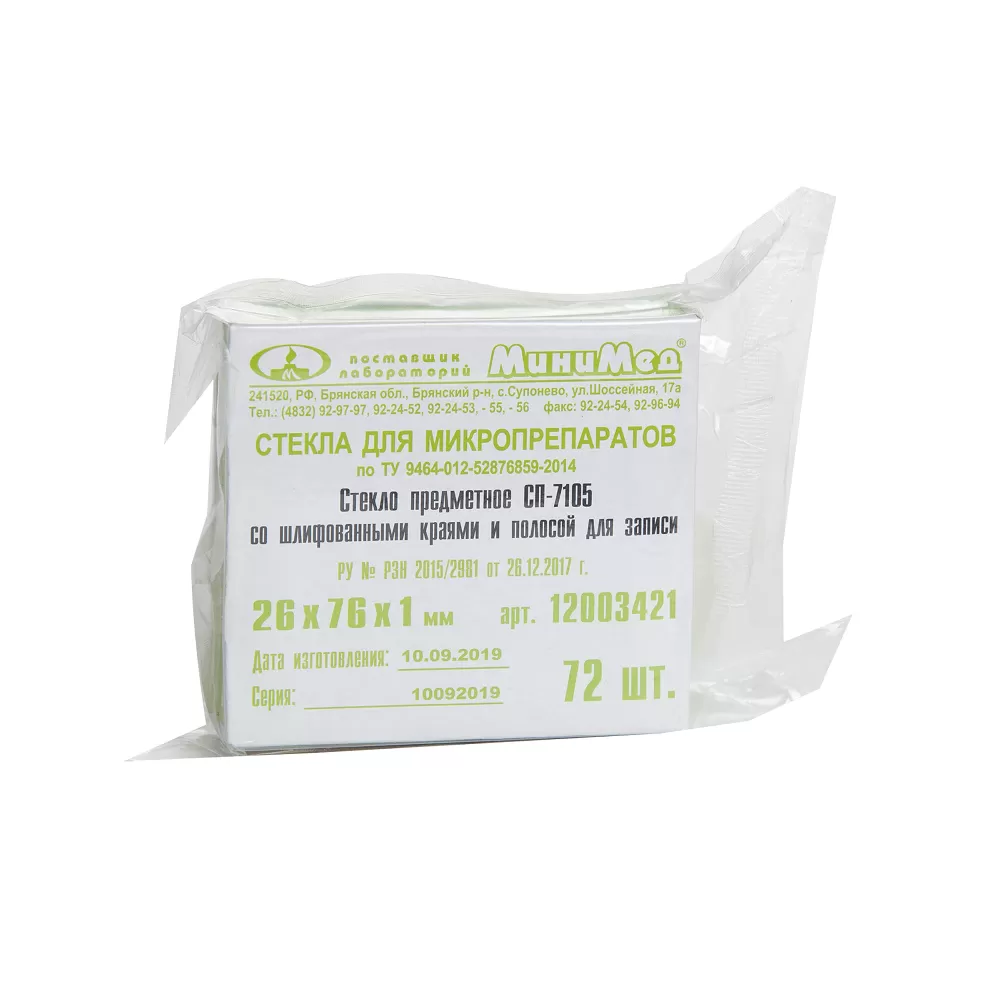 Стекло предметное со шлифованными краями и полосой для записи предназначено для микроскопирования в видимой области спектра. Полоса выполнена травлением стекла, это позволило получить поверхность удобную для записи. Изготовлено из прозрачного бесцветного силикатного стекла.