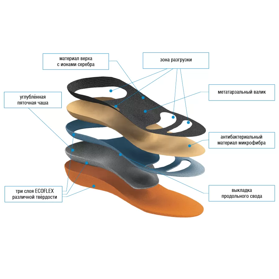 - стельки имеют три слоя ECOFLEX различной твердости для снижения ударной нагрузки в проблемных зонах стопы в области плюсны и в пяточной зоне;