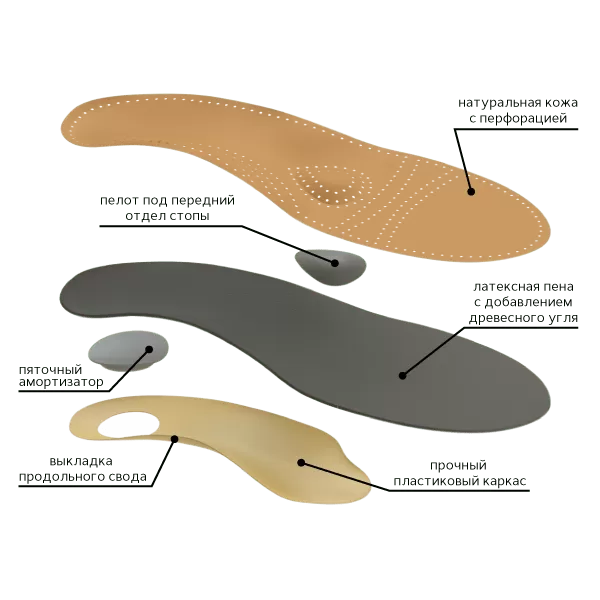 - основание стелек — латексная пена с добавлением древесного угля, нейтрализующего запах и впитывающего влагу