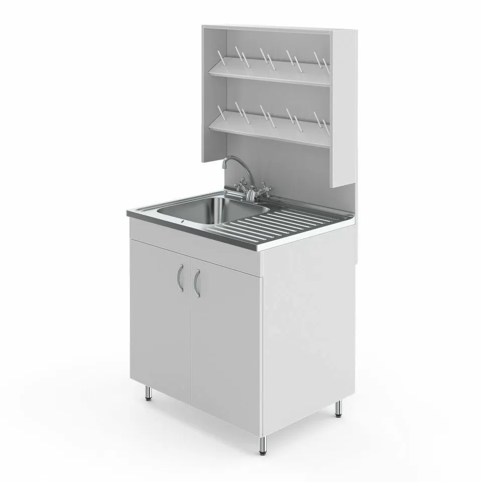 НВ-800 МО — это стол с одной мойкой из нержавеющей стали и с пластиковой сушилкой на 18 мест. Предназначен для работы стоя: высота до столешницы 85 см.