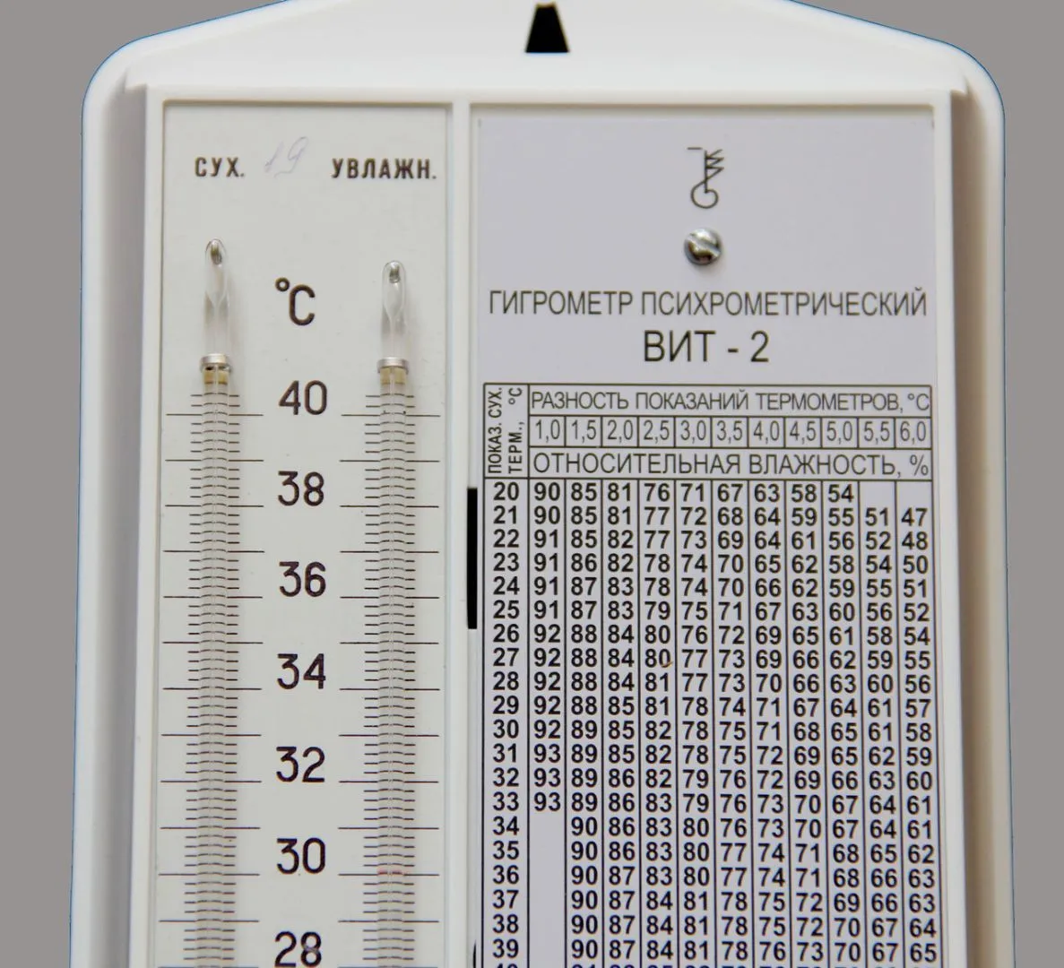 Состоят из пластмассового основания, на котором закреплены температурная шкала с двумя капиллярами, резервуар одного из которых увлажняется фитилем из ткани, опущенным в питатель с водой, и таблица для определения относительной влажности воздуха по разнице показаний «сухого» и «увлажненного». Питатель закреплен с внутренней стороны основания. Шкальная пластина и таблица – металлические.