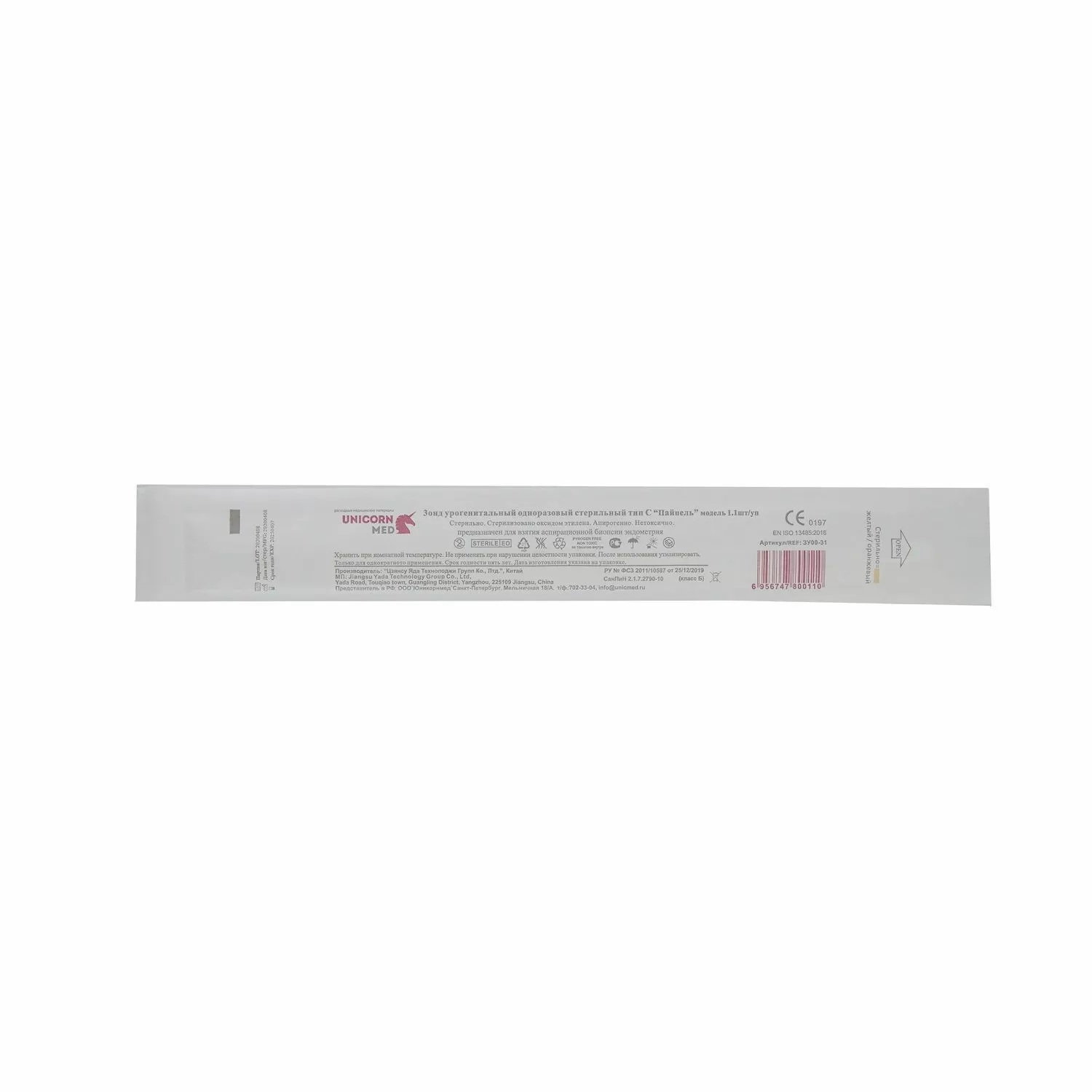 Внутриматочная кюретка из высококачественного полимерного материала с пластиковым поршнем. Зонд имеет закрытый конец с 4 боковыми отверстиями, состоит из двух частей: поршня с ограничителем и зонда. На зонд нанесена маркировка глубины введения, поршень цилиндрической формы с ручкой для удержания и ограничителем глубины введения в зонд.
